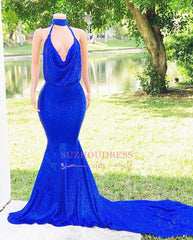 Elegant Halter Sleeveless Mermaid Prom Dresses | Sequins Royal Blue Evening Gown
